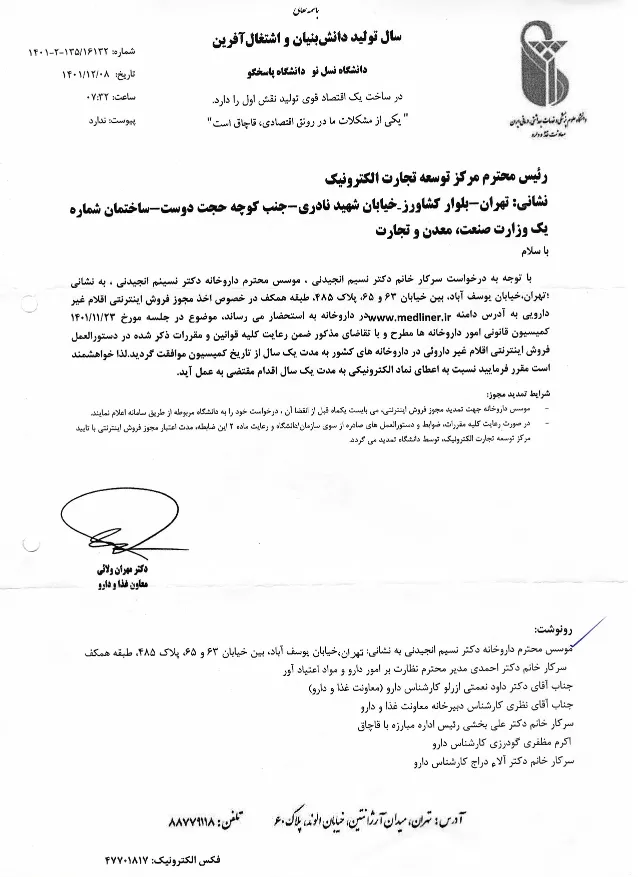 بر طبق قانون، فروش اقلام دارویی از طریق سایت امکانپذیر نمیباشد. مجوز فروش آنلاین اقلام غیر دارویی از طریق سایت را میتوانید در زیر مشاهده کنید.